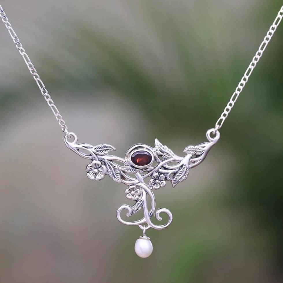 Floral Garnet and Cultured Pearl Pendant Necklace 'Garden Vine' Item ID: 2671735348