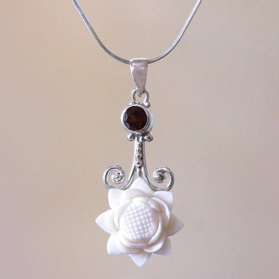 Floral Garnet Pendant Necklace from Bali 'Glittering Padma' Item ID: 2671737841