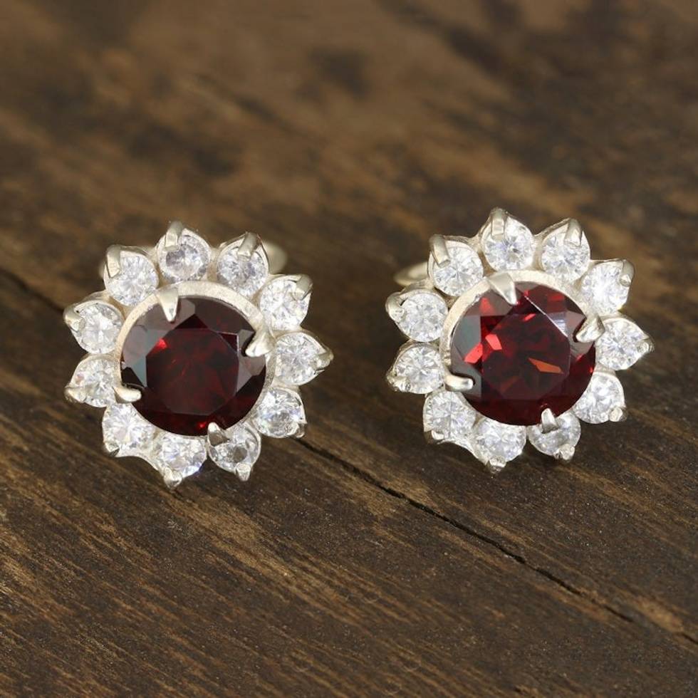Floral Garnet Stud Earrings Crafted in India 'Gleaming Flower' Item ID: 2671789620
