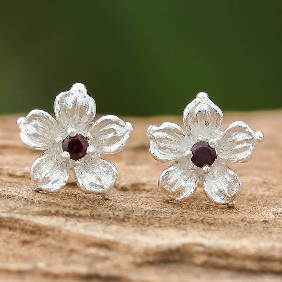 Floral Garnet Stud Earrings from Thailand 'Winter Blooms' Item ID: 2669926182
