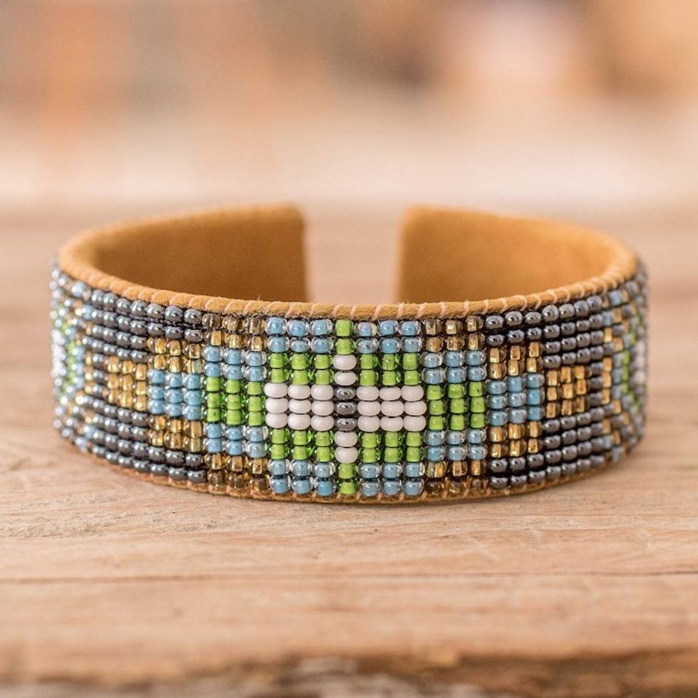 Floral Glass Beaded Cuff Bracelet with Leather Structure 'Colorful Blooming' Item ID: 2669934175