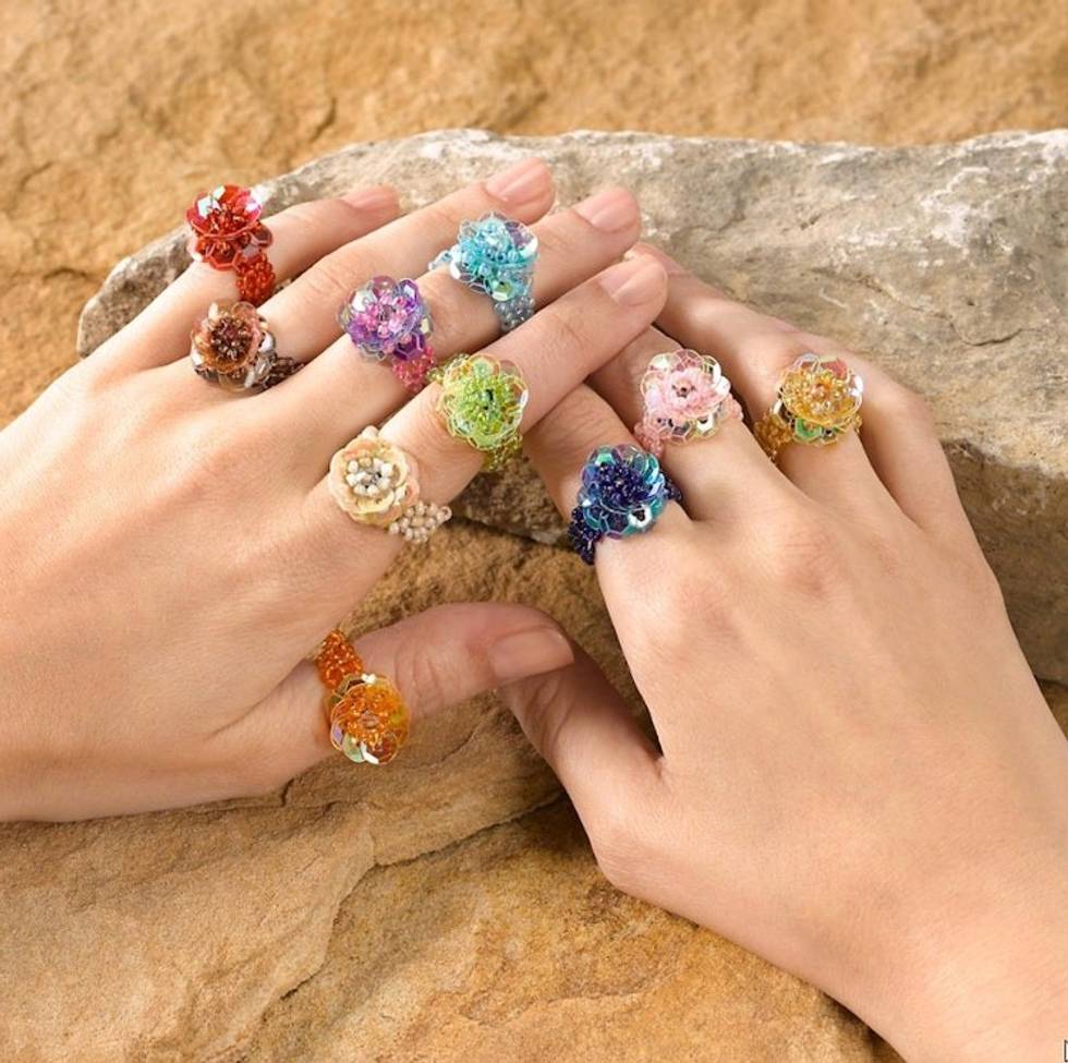 Floral Glass Beaded Stretch Cocktail Rings Set of 10 'Javanese Flora' Item ID: 2671476239