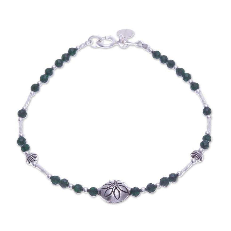 Floral Green Glass and Silver Beaded Bracelet from Thailand 'Petals of Forest' Item ID: 2676647468