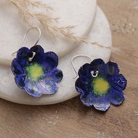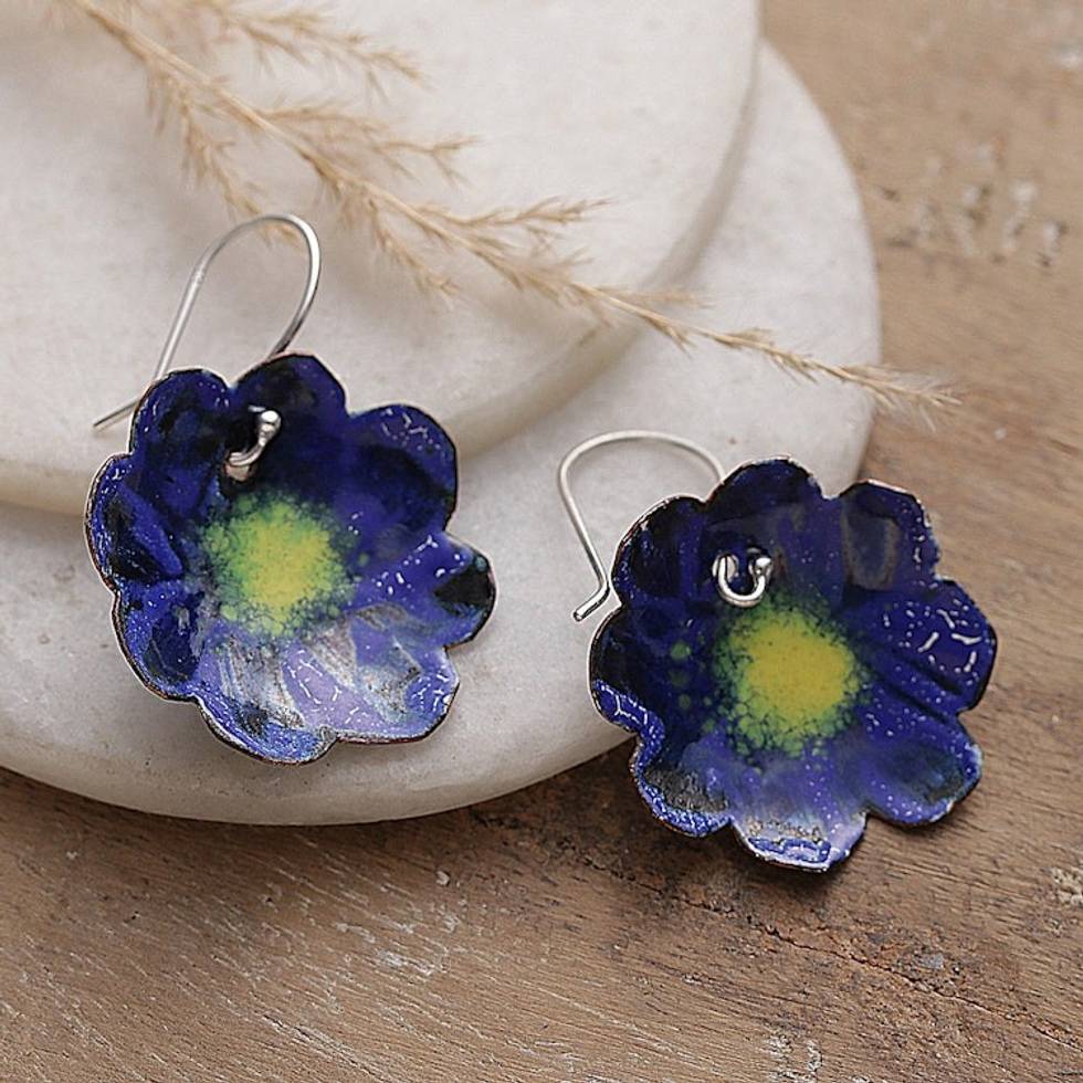 "Experience an endless spring with these copper earrings from India. Artisan Kavita portrays the season in blue and yellow enamel hues, hand-painted over flower-shaped dangle earrings. Made to exude palatial beauty, the pair has comfy sterling silver hooks."
