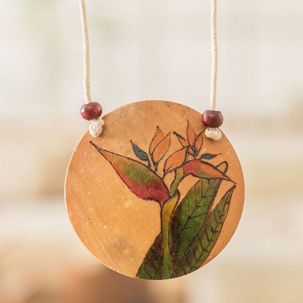 "Spring awakens in Ruth Guevara's newest design, inspired by the charming flowers blooming in this sweet season. The Costa Rican artisan works on a calabash gourd piece, painting a little bird of paradise flower whose color symbolizes immortality. This pendant necklace is also decorated with pinewood beads, and its ivory-toned cord can be adjusted to your liking."