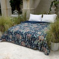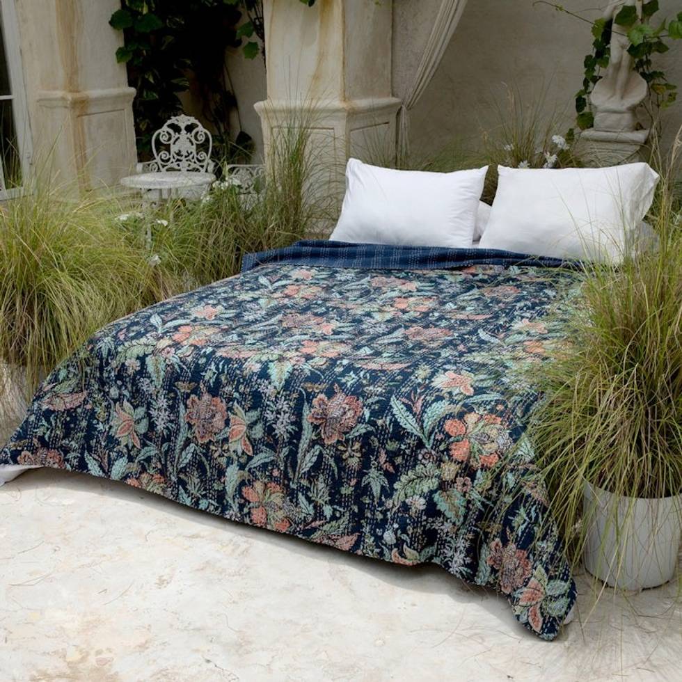 Floral Kantha Embroidered Indigo Blue Cotton Queen Bedspread 'Midnight Spring' Item ID: 2671624992