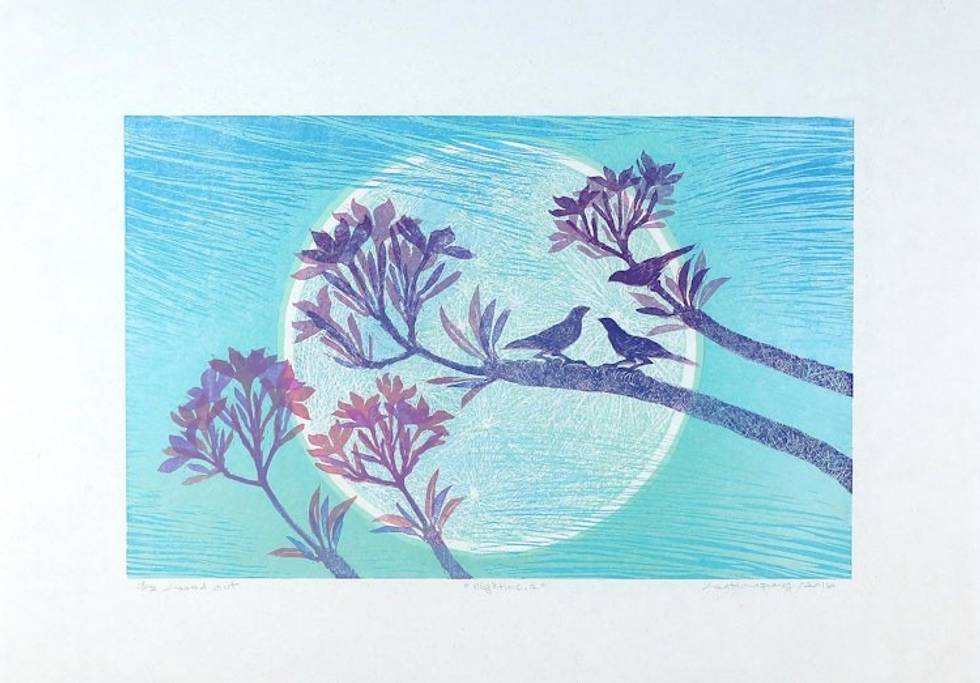 "Bathed in silvery moonlight, the Northern Thai landscape is a paradise of peace. Birds perch on a flowering frangipani branch as Det invokes the magic of the night. The artist works in the woodcut technique, selecting a cool palette of blue and violet."