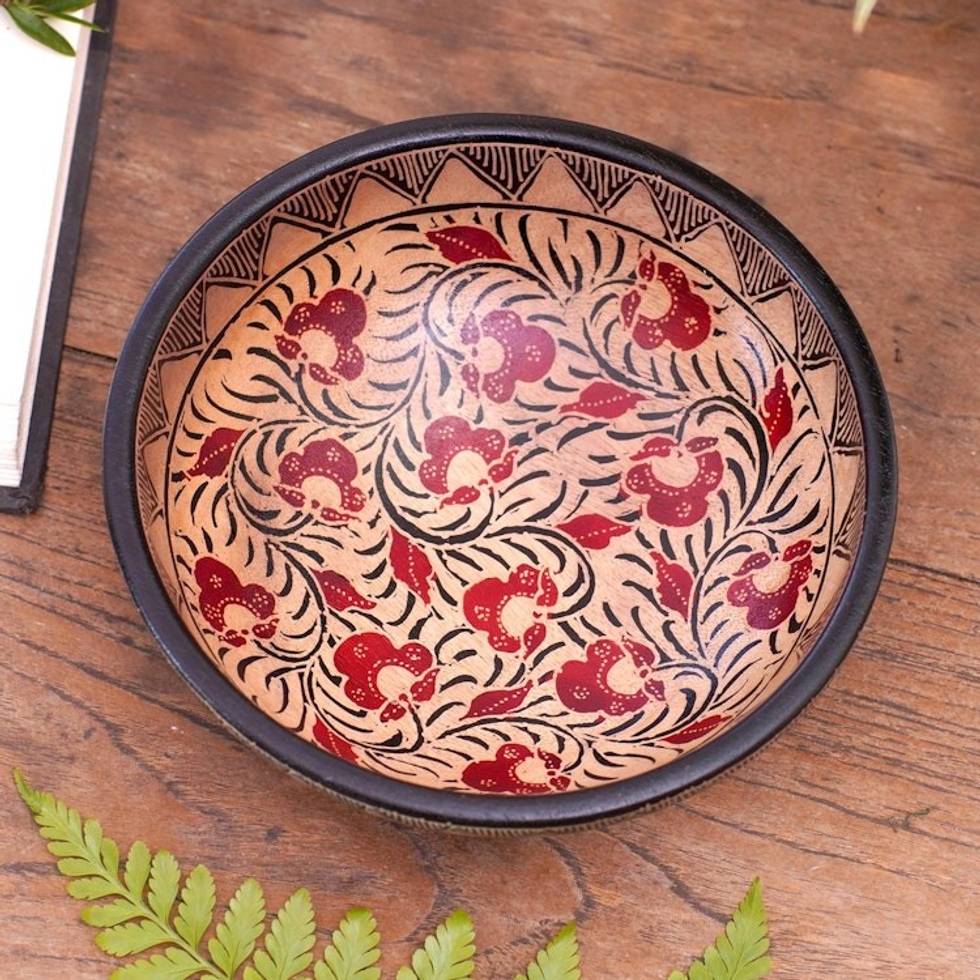Floral Motif Batik Wood Decorative Bowl from Bali 'Lok Chan Flowers' Item ID: 2671736549