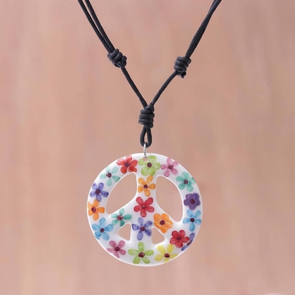 Floral Motif Ceramic Peace Pendant Necklace from Thailand 'Flower Child' Item ID: 2671641431