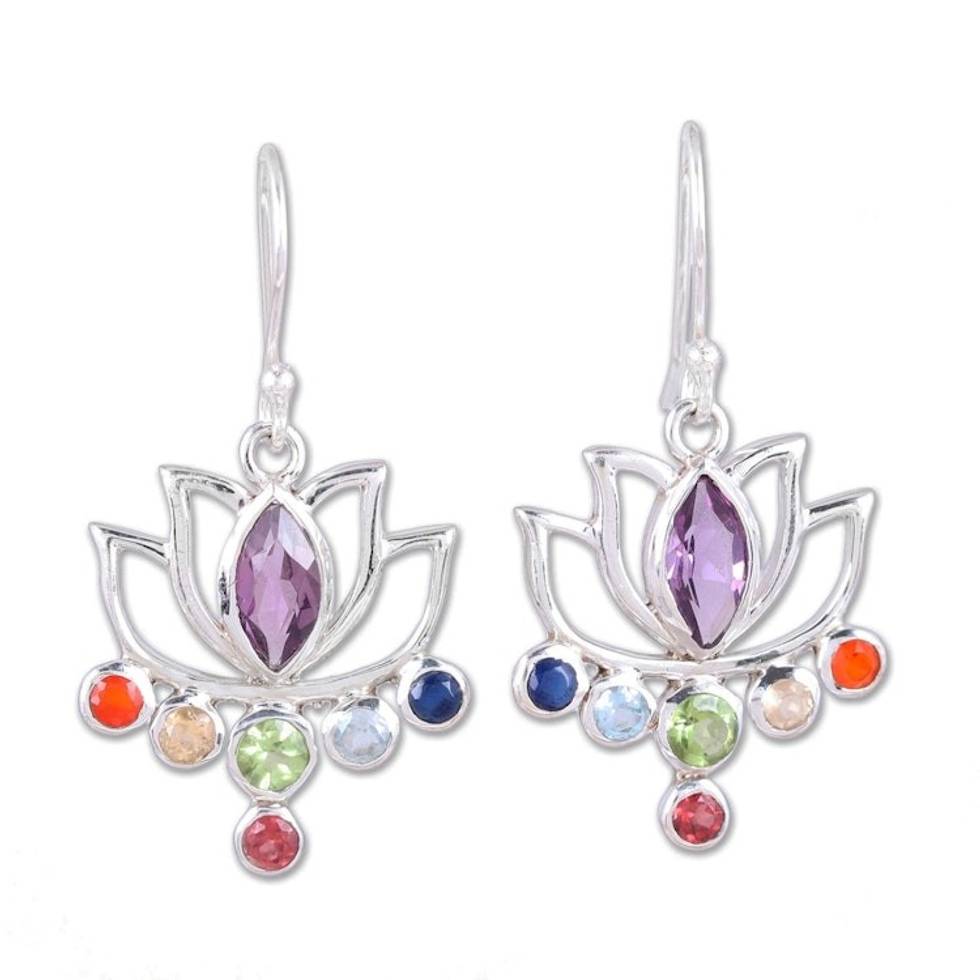 Floral Multi-Gemstone Chakra Dangle Earrings from India 'Lotus Chakra' Item ID: 2671620001