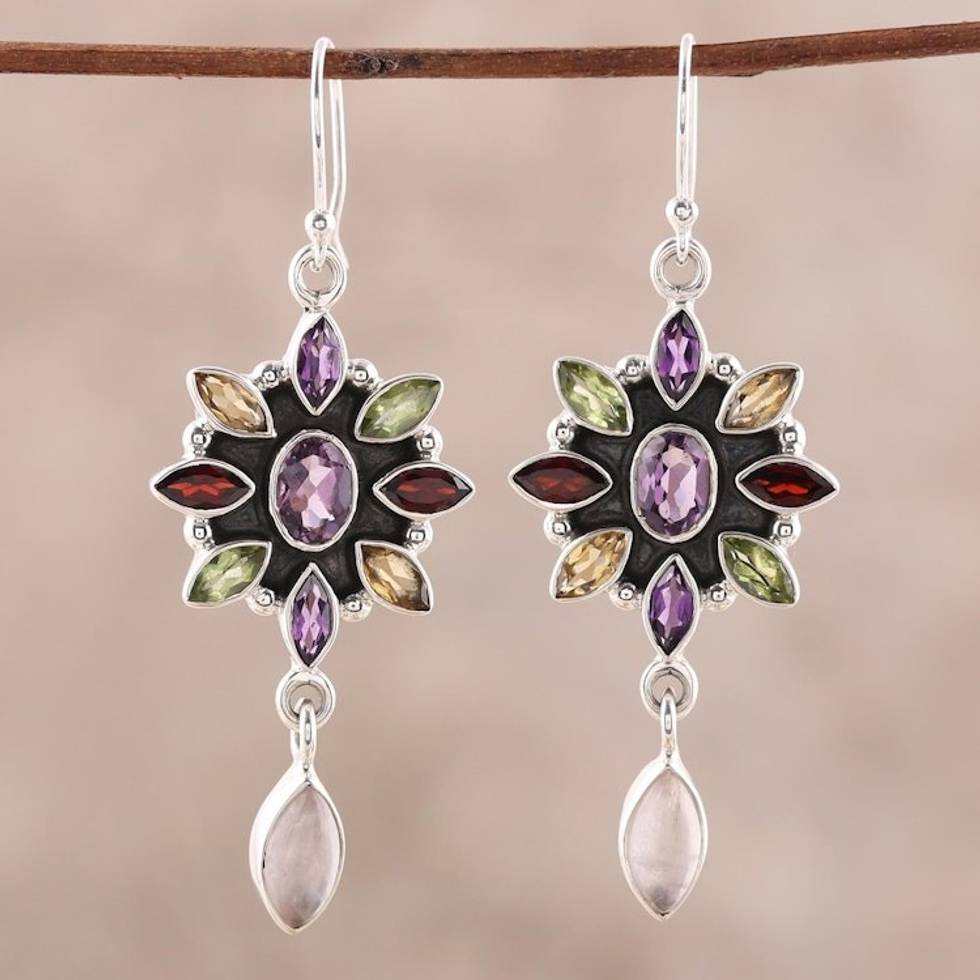 Floral Multigem Dangle Earrings from India 'Precious Petals' Item ID: 2671794927