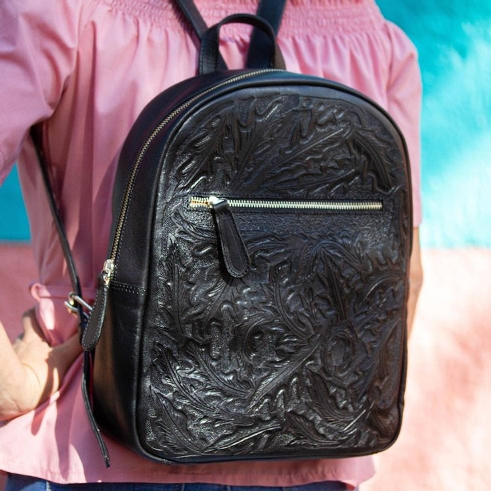 Floral Pattern Leather Backpack in Black from Mexico 'Onyx Floral Artisan' Item ID: 2671808170