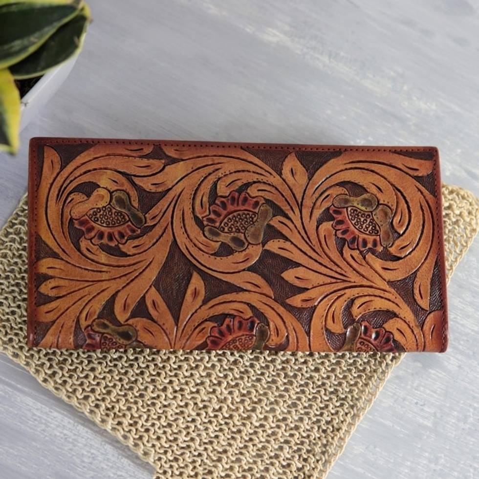 Floral Pattern Leather Wallet in Brown Crafted in India 'Mughal Vines' Item ID: 2671789727