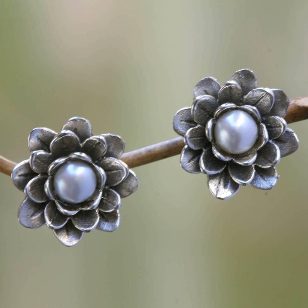 Floral Pearl and Sterling Silver Button Earrings 'White-Eyed Lotus' Item ID: 2669922085