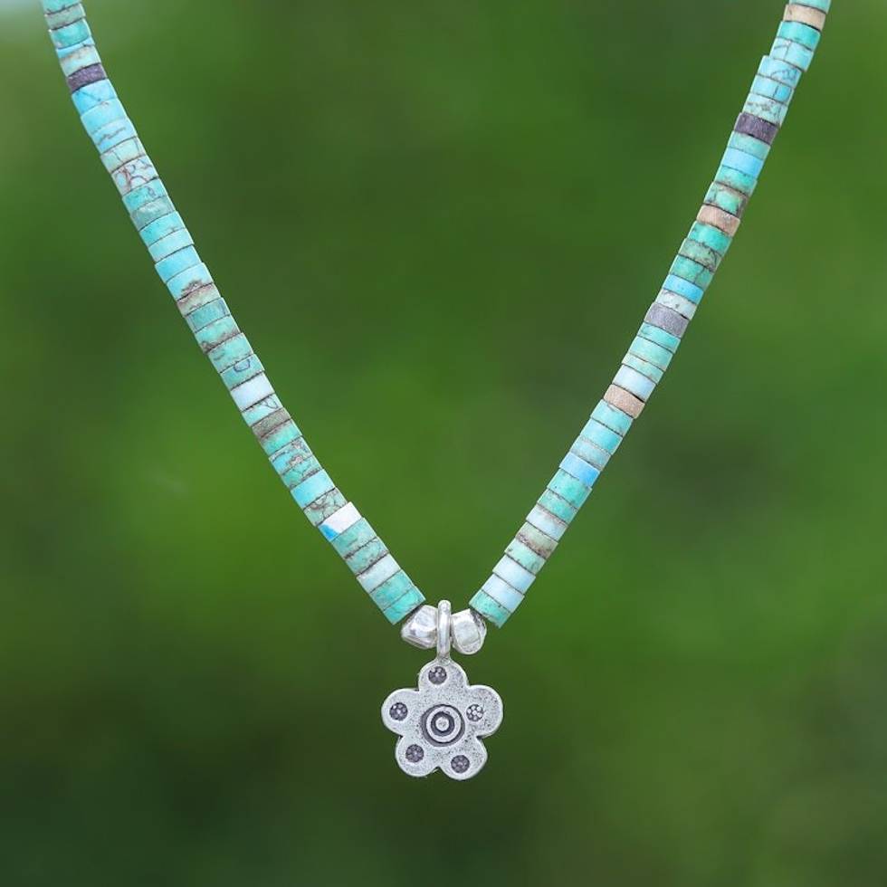 Floral Reconstitued Turquoise Silver Pendant Necklace 'Arcadia Flower' Item ID: 2669926313