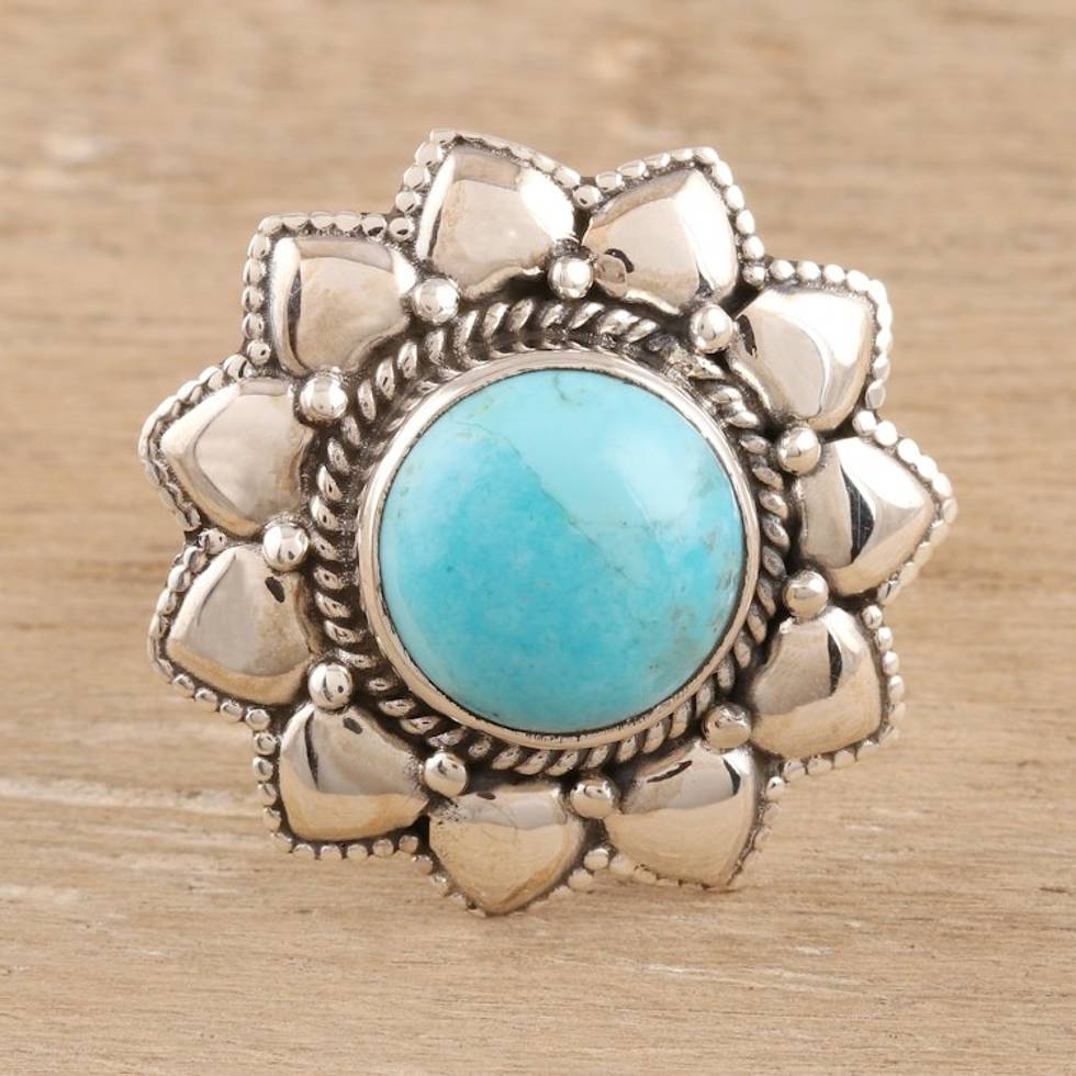 Floral Reconstituted Turquoise Cocktail Ring from India 'Flower of the Sky' Item ID: 2669924023
