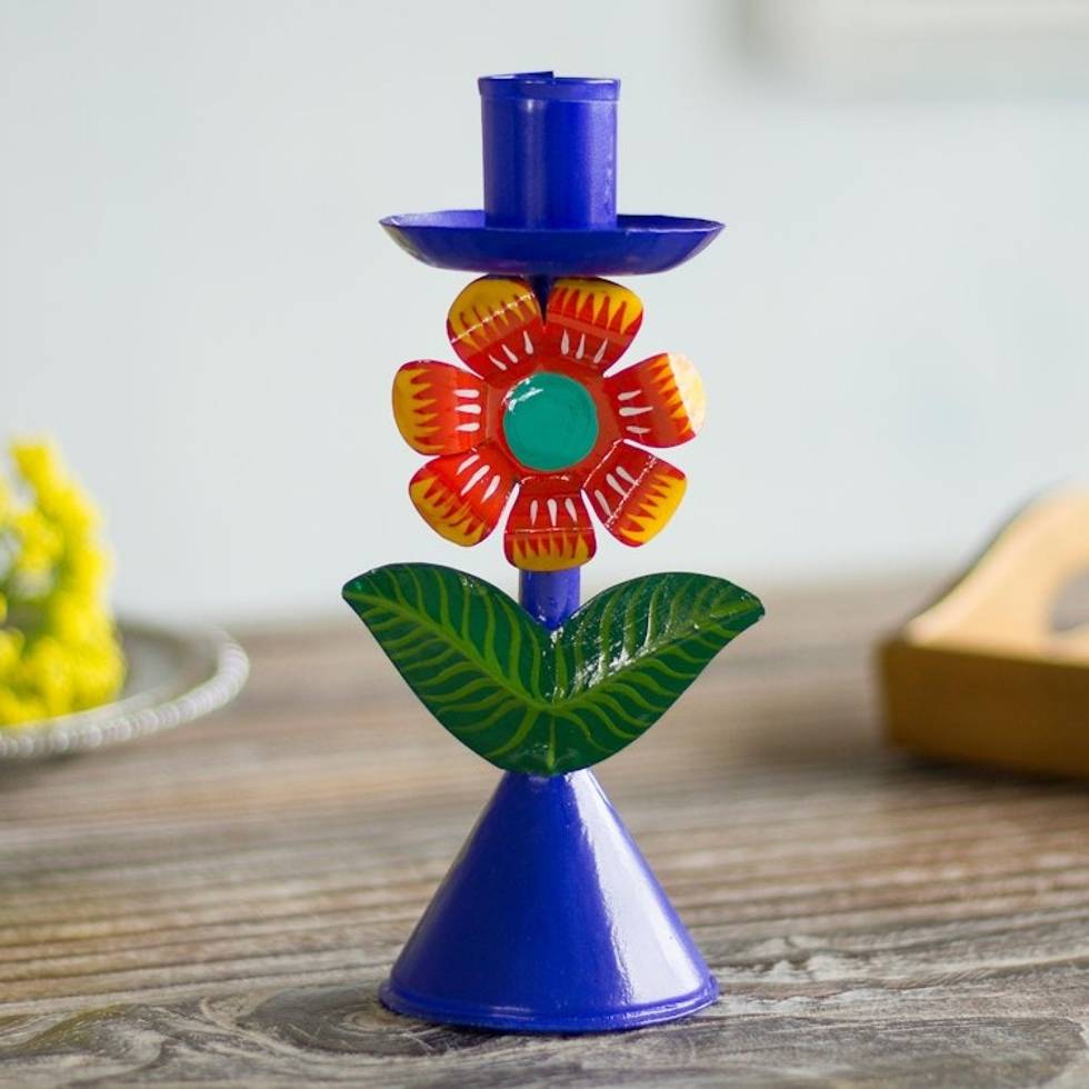Floral Recycled Metal Candle Holder in Blue from Peru 'Highland Flower in Blue' Item ID: 2671820077