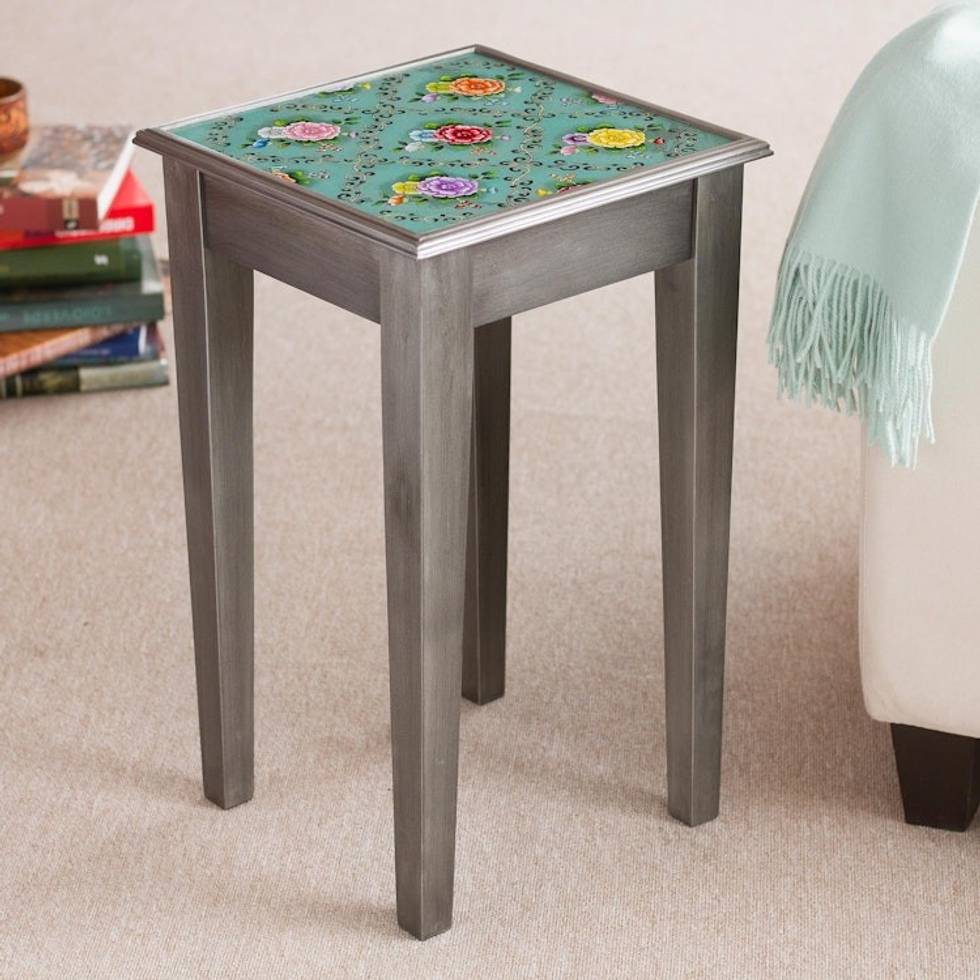 Floral Reverse-Painted Glass Accent Table from Peru 'Roses of Spring' Item ID: 2671820067