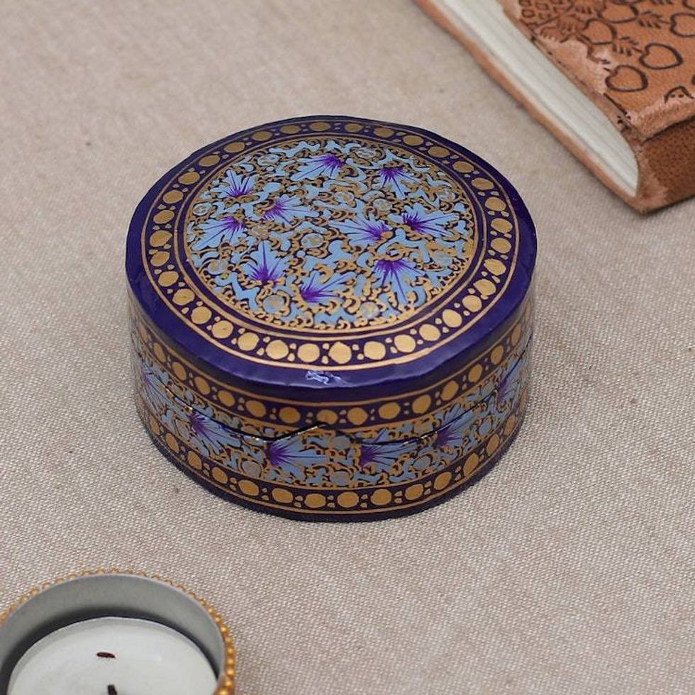 Floral Round Blue Gold-Hued Papier Mache Wood Decorative Box 'Valley Whispers' Item ID: 2676663992