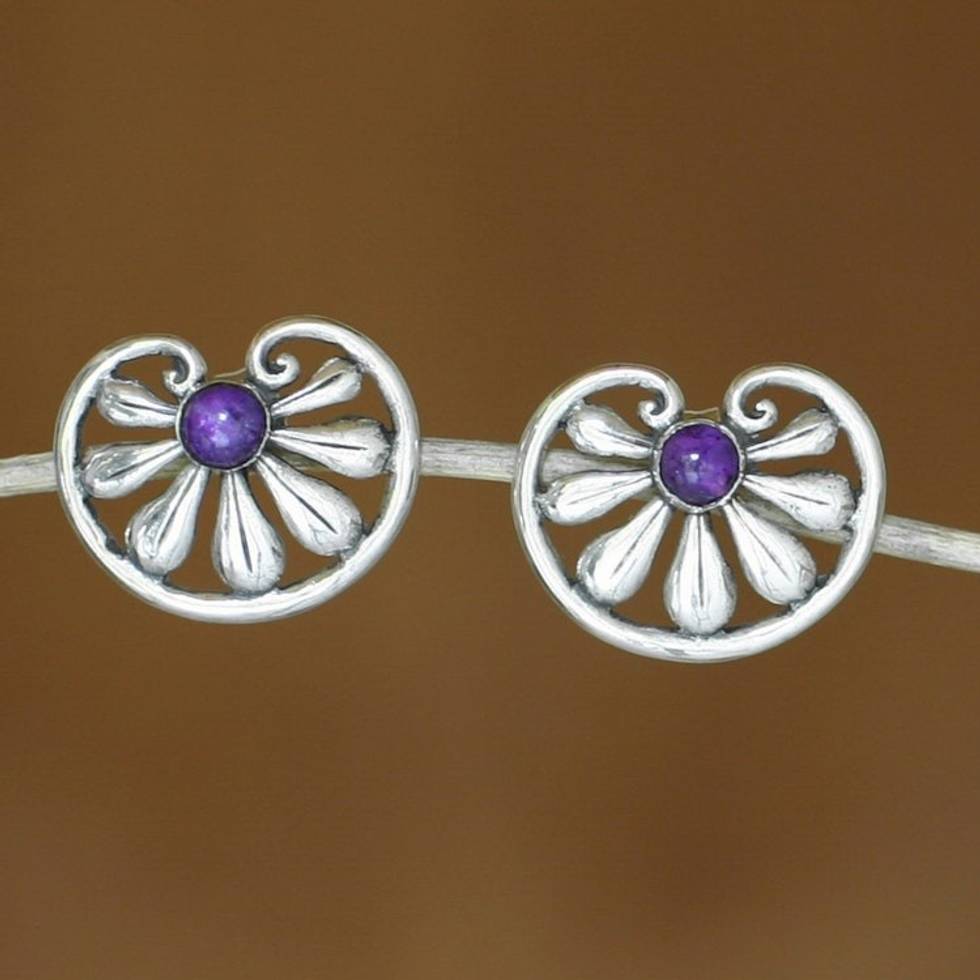 Floral Sterling Silver Amethyst Button Earrings 'Polished Petals' Item ID: 2671821464