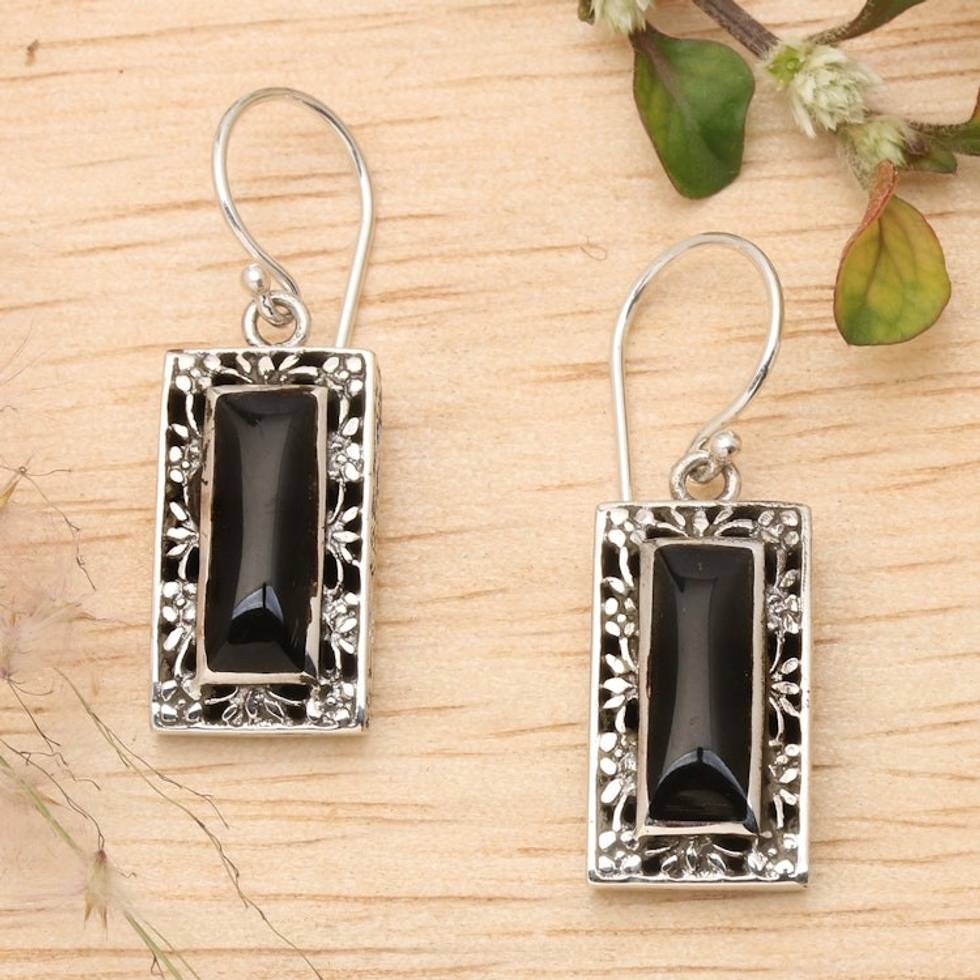 Floral Sterling Silver and Black Resin Dangle Earrings 'Night Mirror' Item ID: 2671671134