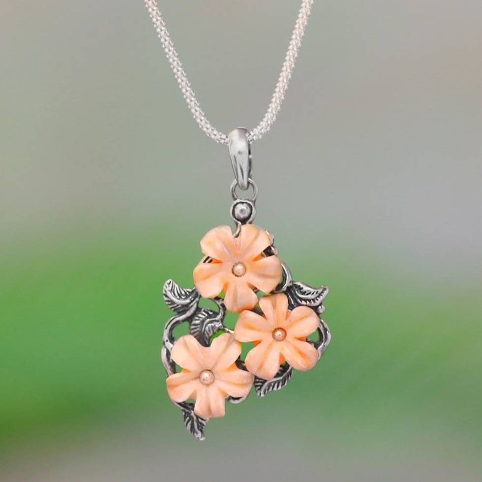 "Hand-carved from natural bone, a trio of plumeria, or frangipani flowers, are featured in the pendant of this lovely necklace from Java. Designed by Rosalia Tarigan, the pendant is crafted with leaves of sterling silver. Sterling silver popcorn chain circles the neck."