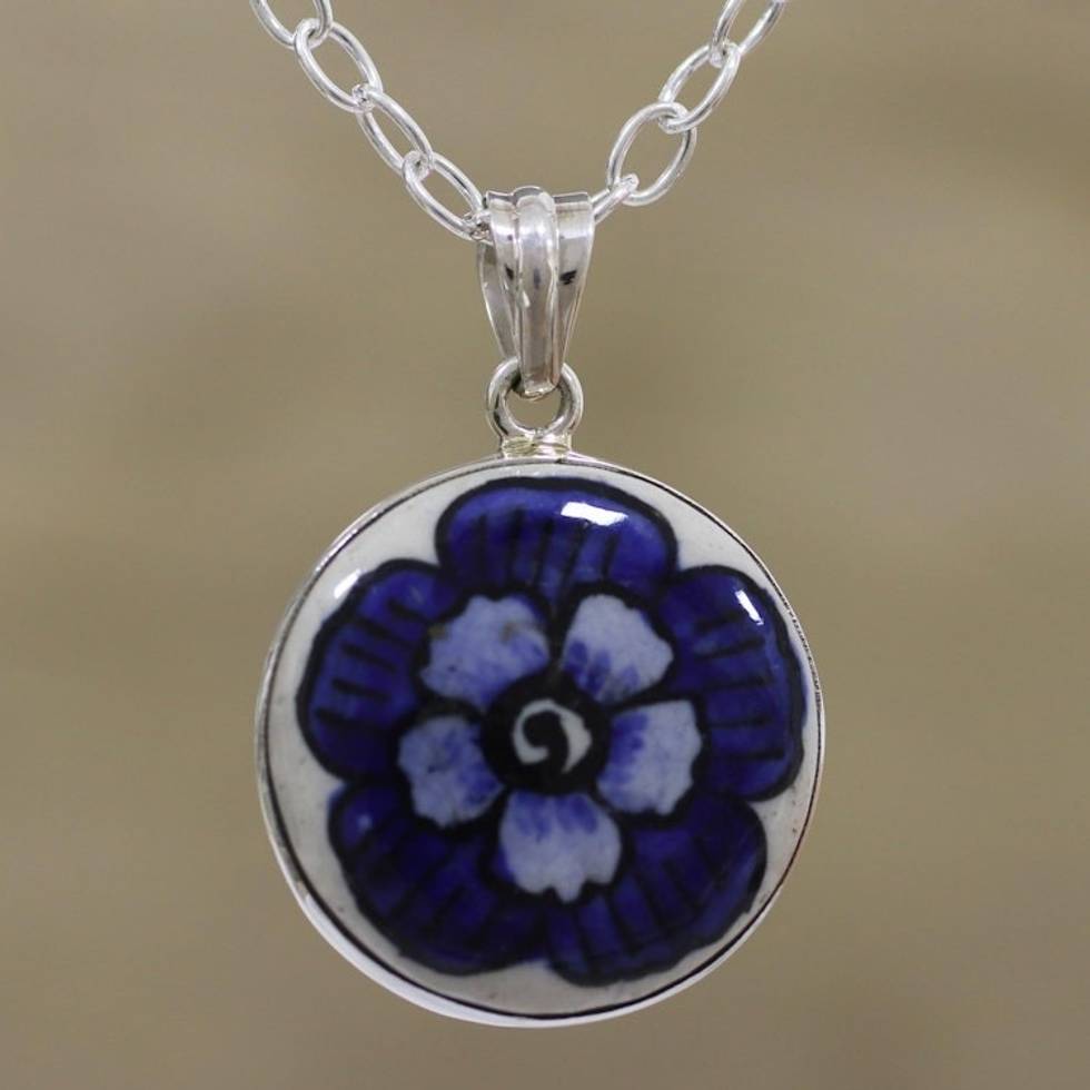 Floral Sterling Silver and Ceramic Necklace from India 'Glorious Bloom' Item ID: 2671790630