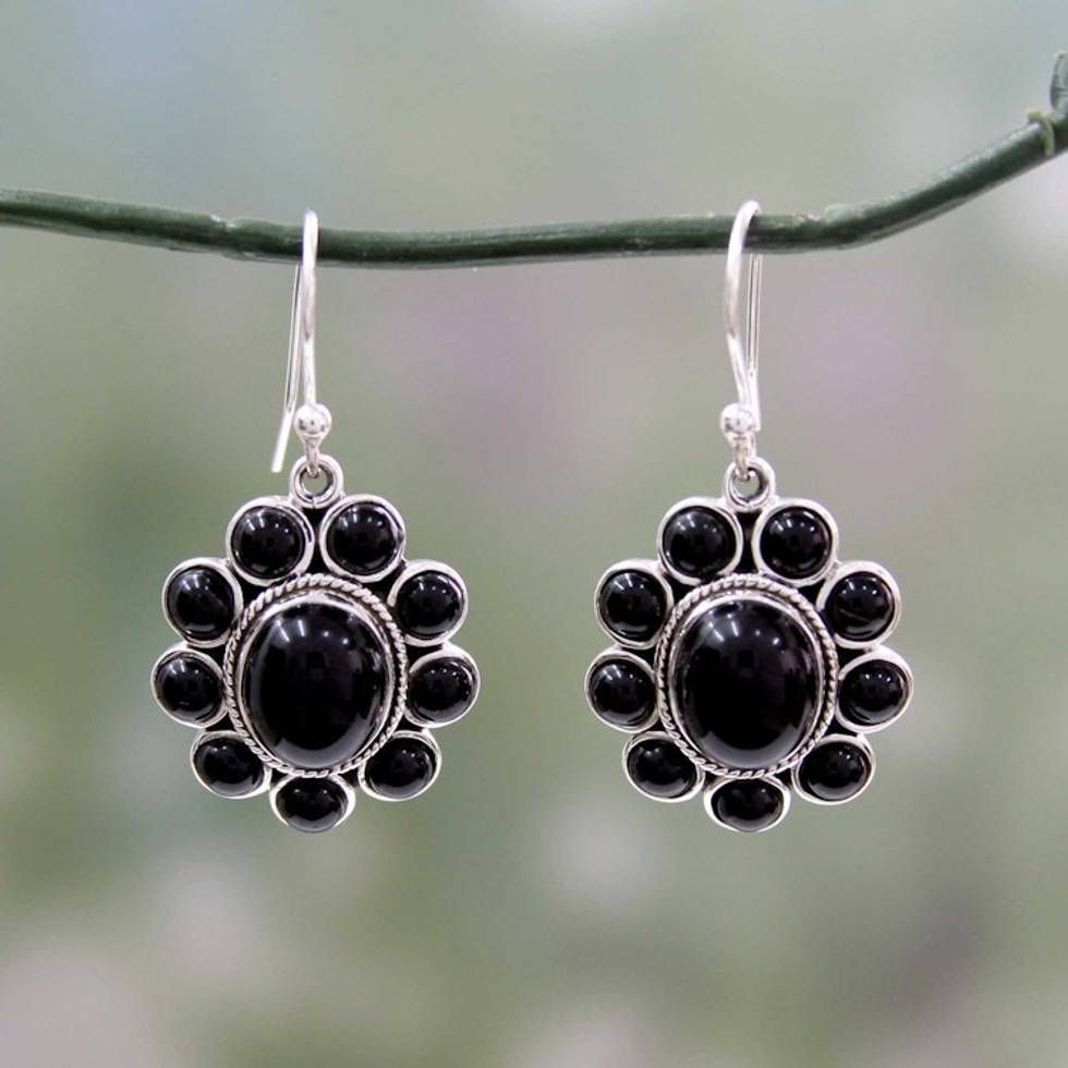 Floral Sterling Silver and Onyx Hand Crafted Earrings 'Night Drama' Item ID: 2669925199