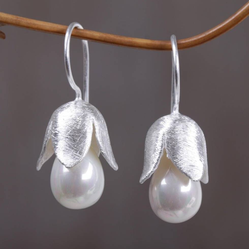 Floral Sterling Silver and Pearl Earrings 'Floral Bud' Item ID: 2669921905
