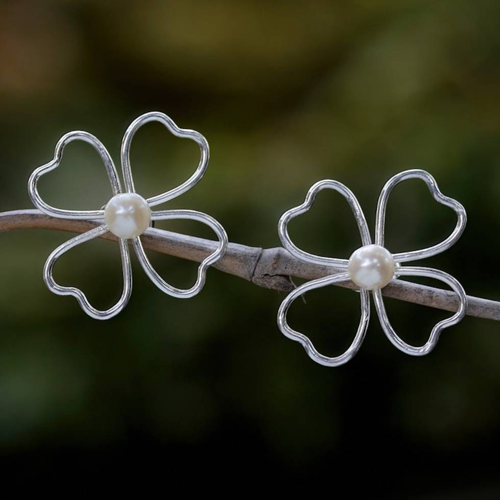 Floral Sterling Silver Button Earrings with Cultured Pearls 'Precious Silhouettes' Item ID: 2671763214