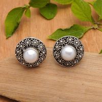 Floral Sterling Silver Button Earrings with White Pearls 'Innocence Bouquet' Item ID: 2671764851