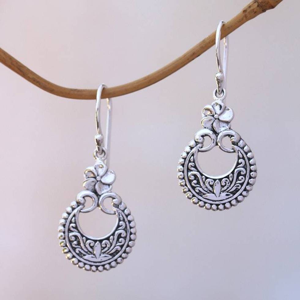 Floral Sterling Silver Dangle Earrings Crafted in Bali 'Frangipani Crescents' Item ID: 2676658977