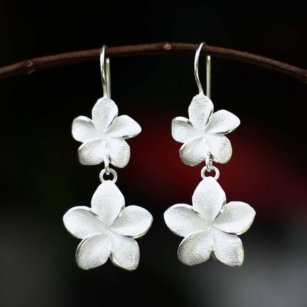 Floral Sterling Silver Dangle Earrings 'Frangipani Twins' Item ID: 2671698587
