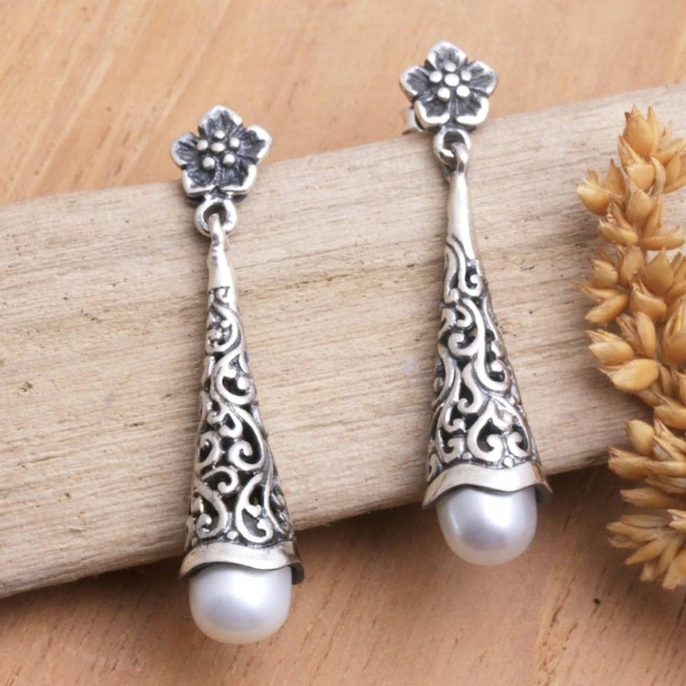 Floral Sterling Silver Dangle Earrings with Grey Pearls 'Floral Lantern' Item ID: 2671763491