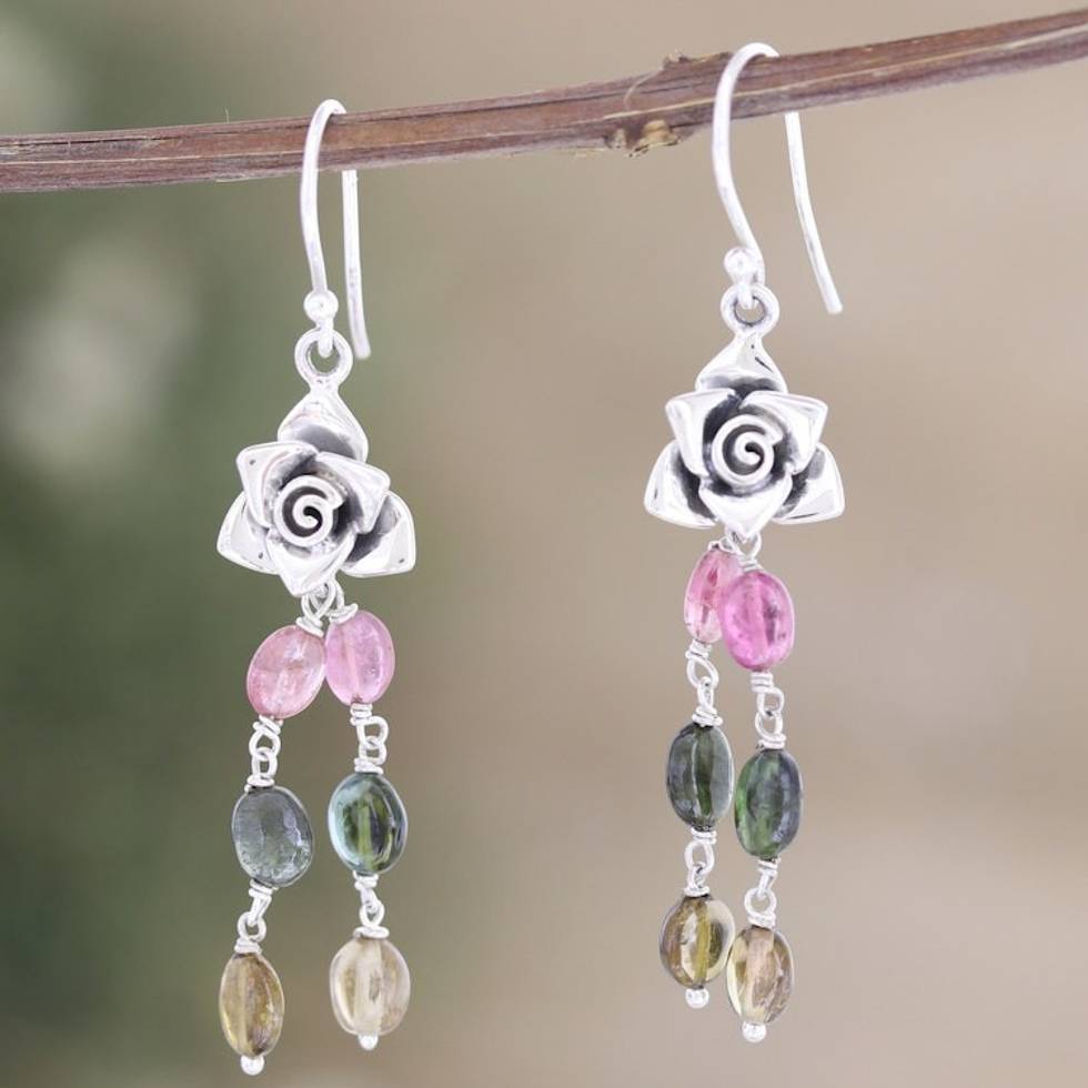 Floral Sterling Silver Dangle Earrings with Tourmaline Beads 'Love Rose' Item ID: 2671625344