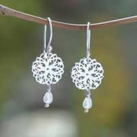 Floral Sterling Silver Dangle Earrings with White Pearls 'September Blooms' Item ID: 2671764804