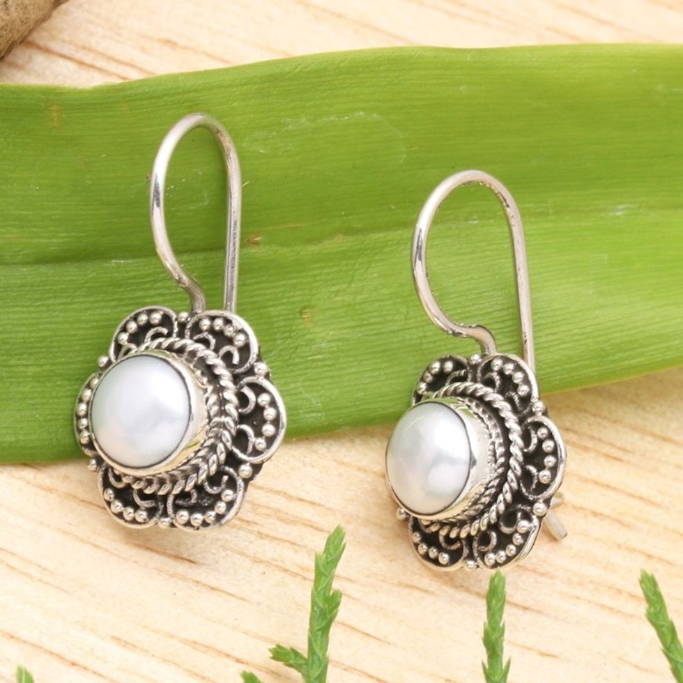 Floral Sterling Silver Drop Earrings with Cultured Pearls 'Iridescent Flower' Item ID: 2671765568