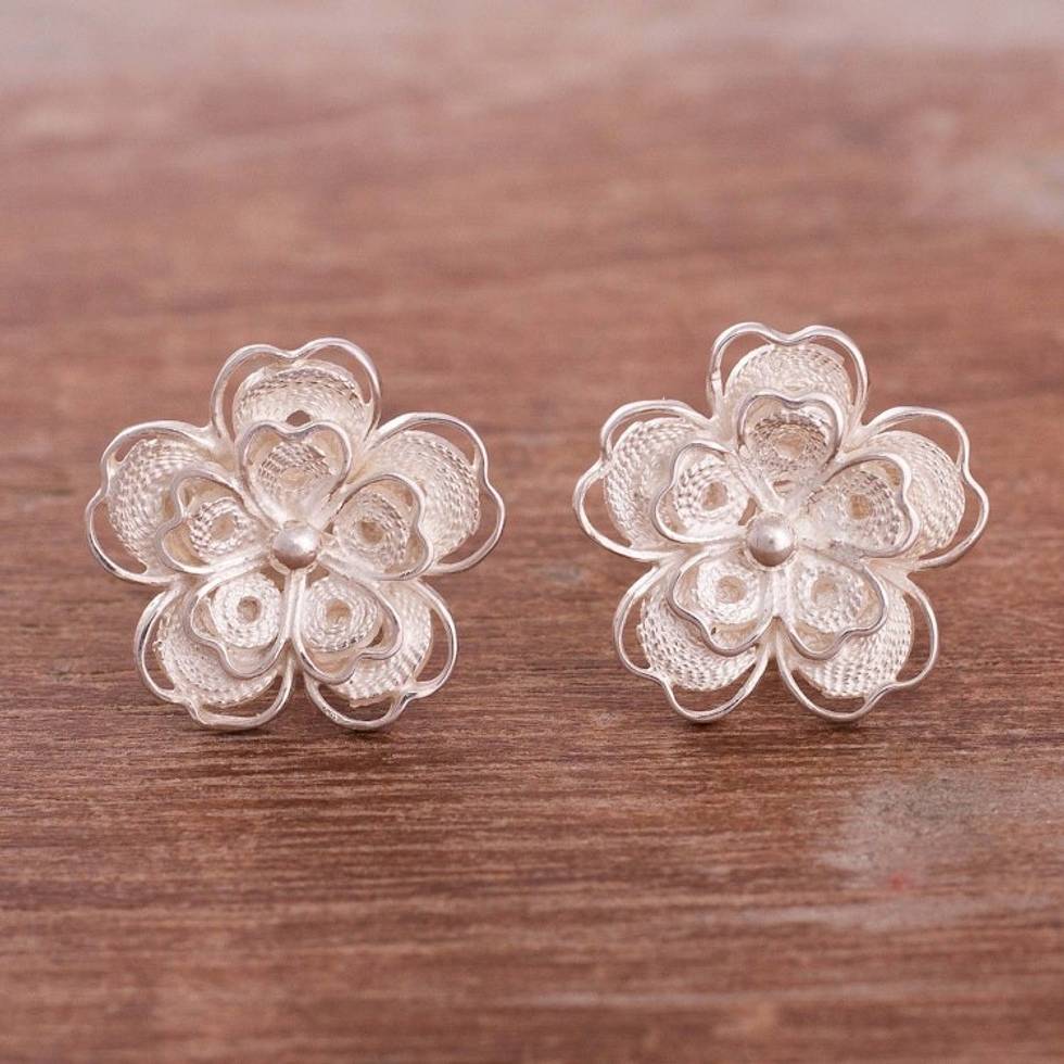Floral Sterling Silver Filigree Button Earrings from Peru 'Intricate Flowers' Item ID: 2669919375