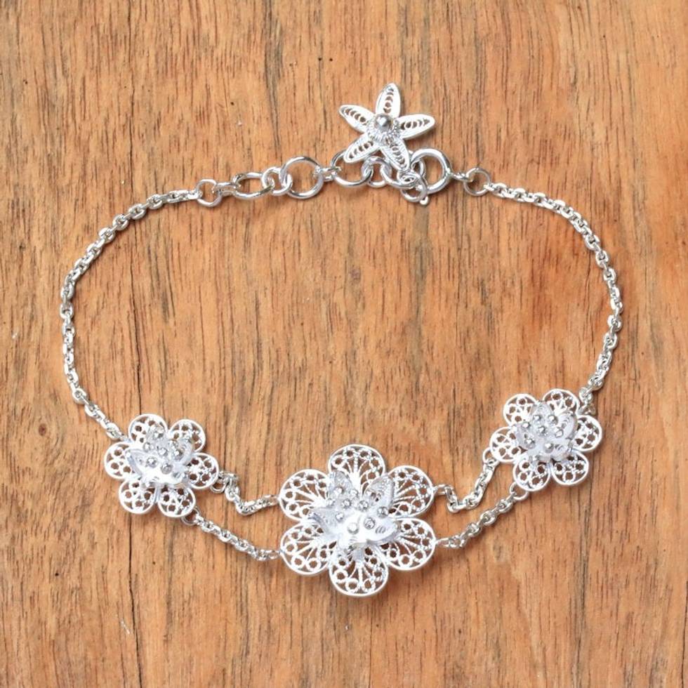 "Handcrafted from intricate sterling silver filigree, three flower pendants center this bracelet from Java. Selly Sagita designs this elegant bracelet, completed by a flower charm that dangles from the clasp."