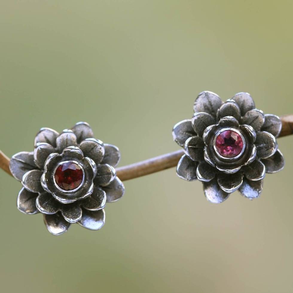 Floral Sterling Silver Garnet Earrings 'Red-Eyed Lotus' Item ID: 2669921249