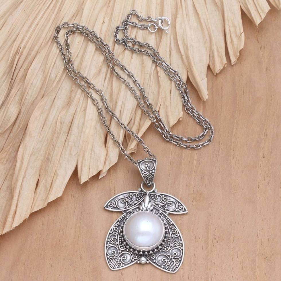 Floral Sterling Silver Pendant Necklace with Grey Pearl 'Blooming Pride' Item ID: 2671747815