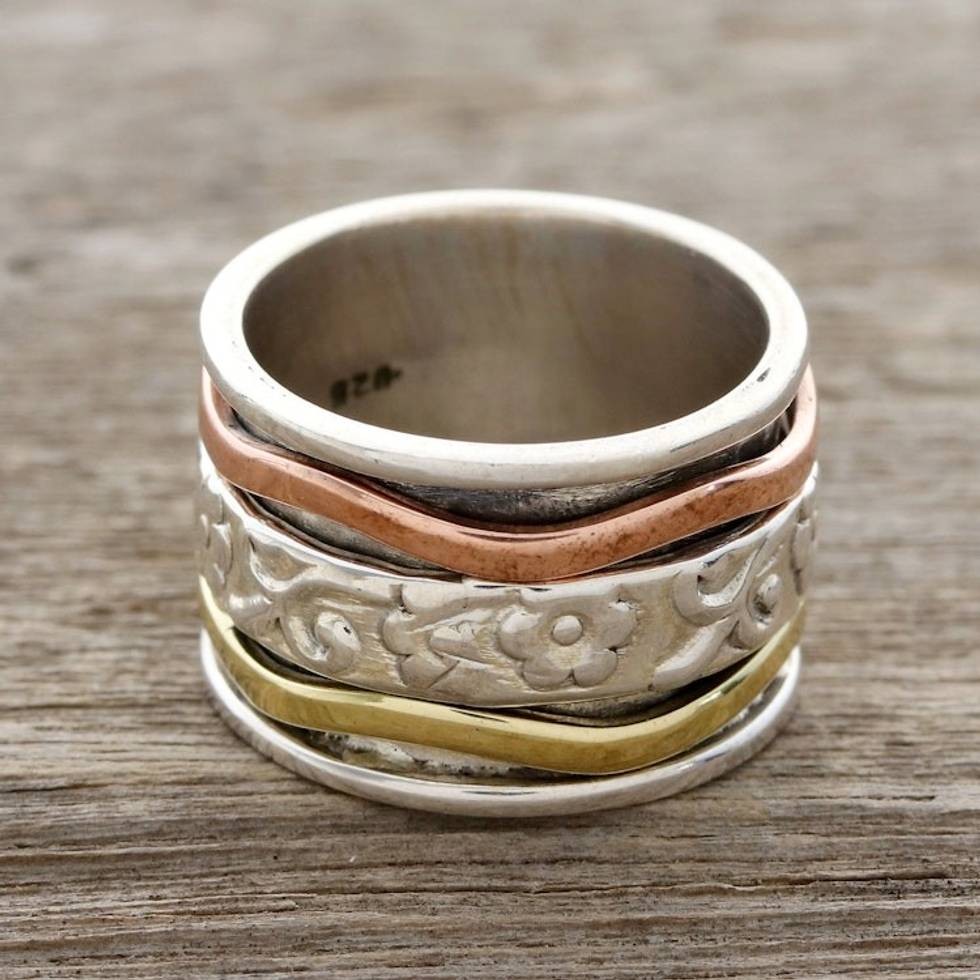 Floral Sterling Silver Spinner Ring with Brass and Copper 'Blossom Delight' Item ID: 2671667424