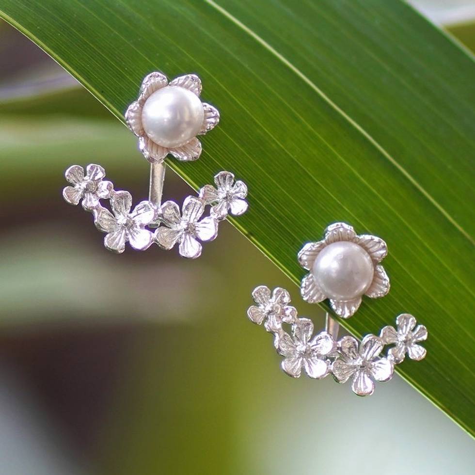 Floral Sterling Silver White Pearl Ear Jacket Earrings 'Pearly Heaven' Item ID: 2671765681