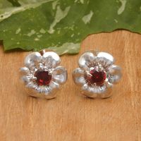 "Shining with a radiant light, these sterling silver stud earrings feature a flower shape that enhances their charming aura. Balinese artisan Karang Adiguna crafts the design using advanced techniques that allow him to add a high-polish finish to each piece. As the central elements, cubic zirconia jewels crown the design with their luxurious red hue, symbolizing passion."