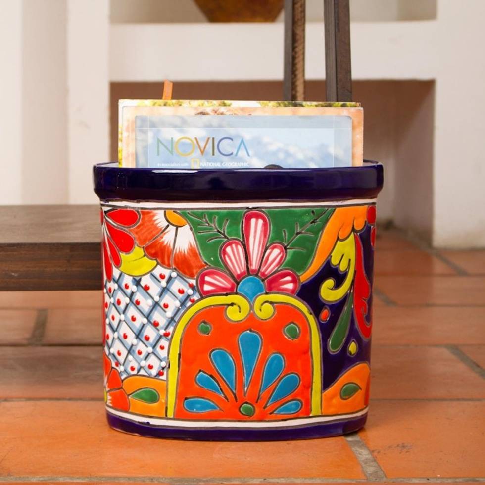 Floral Talavera-Style Ceramic Waste Bin from Mexico 'Talavera Collector' Item ID: 2669926880