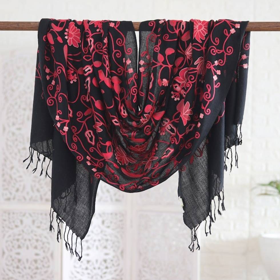 Floral-Themed Wool Shawl with Chain-Stitched Embroidery 'Kashmir Dreams' Item ID: 2669924633