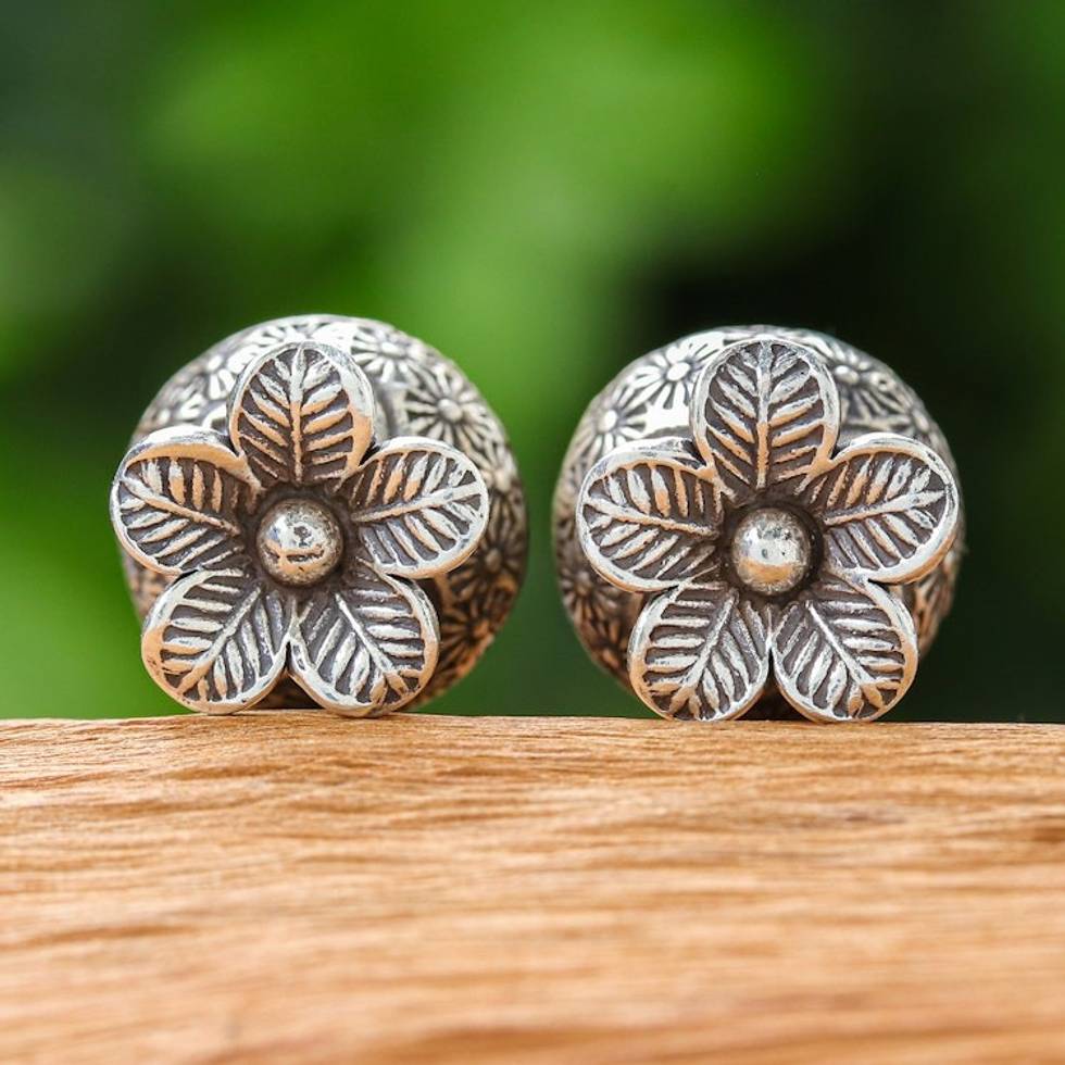 Floral Traditional Silver Button Earrings from Thailand 'Thailand's Blossom' Item ID: 2671797988