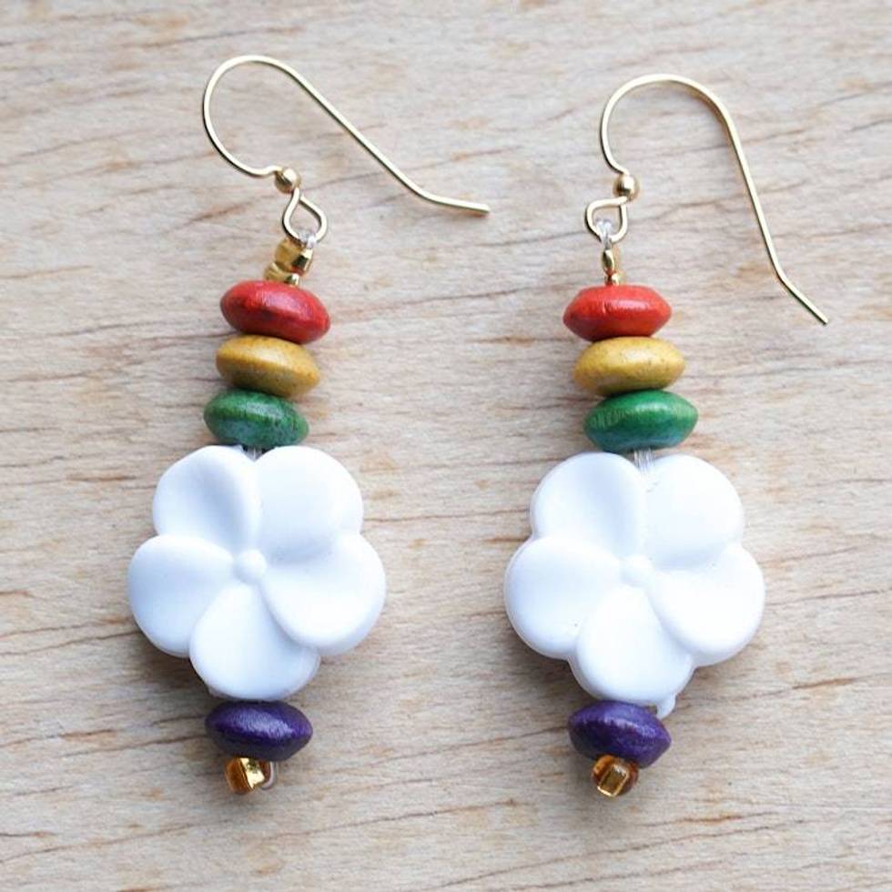 Floral Wood and Recycled Plastic Beaded Dangle Earrings 'Rainbow Petals' Item ID: 2676646508