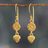 Flower and Heart-Themed Polished Brass Dangle Earrings 'Floral Incantation' Item ID: 2671783193