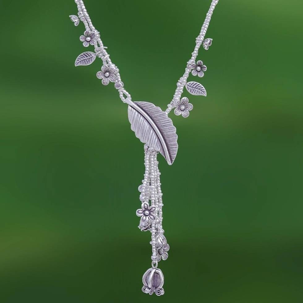 Flower and Leaf Themed 950 Silver Y-Necklace 'Like Paradise' Item ID: 2671798372